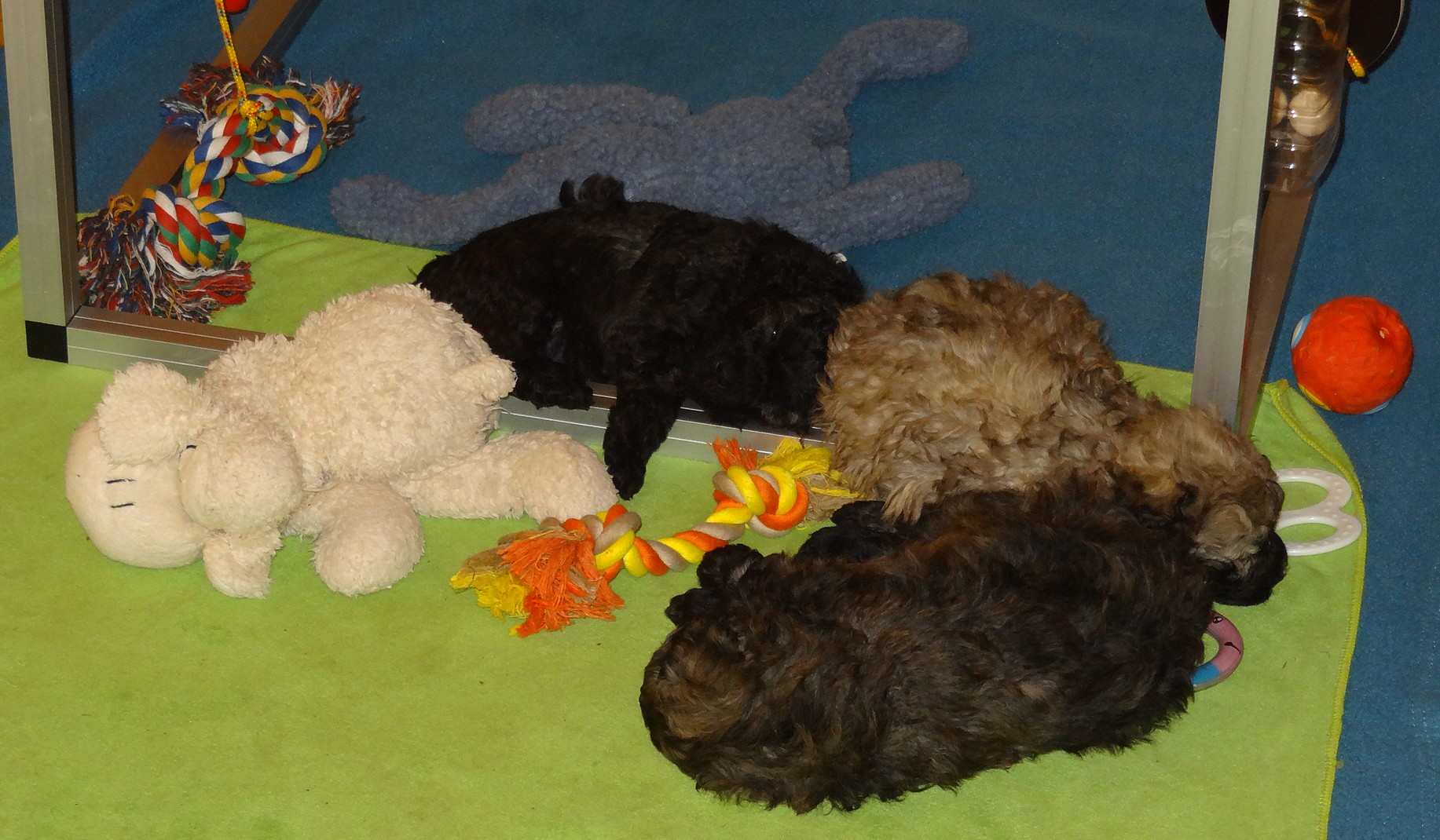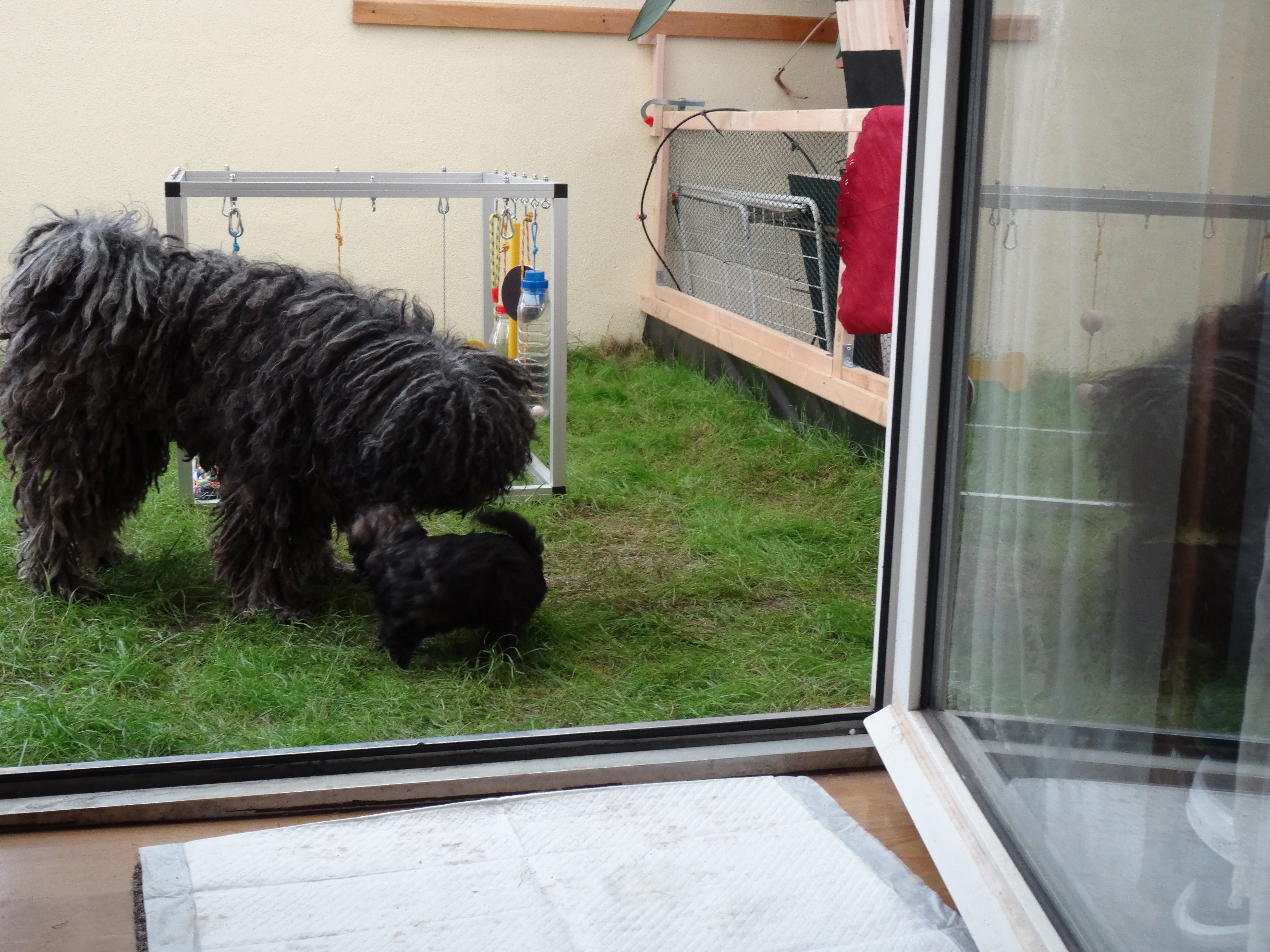 Diese Woche hat aber auch der Ernst des Lebens für uns fünf begonnen: Frauchen meinte, es würde Zeit, dass wir allmählich auf das zukünftige Leben vorbereitet werden müssten. Also hat sie lauter klappernde Sachen an einen Rahmen gehängt, uns dann auch noch den stabielen Decken-Untergrund unter unseren Kleinen Füßchen geklaut. Aber – wie ihr seht – stört uns das überhaupt nicht! Im Gegenteil!! Es macht uns unendlich viel Spaßauf allem möglichen herunzutapsen – und zu kauen!!