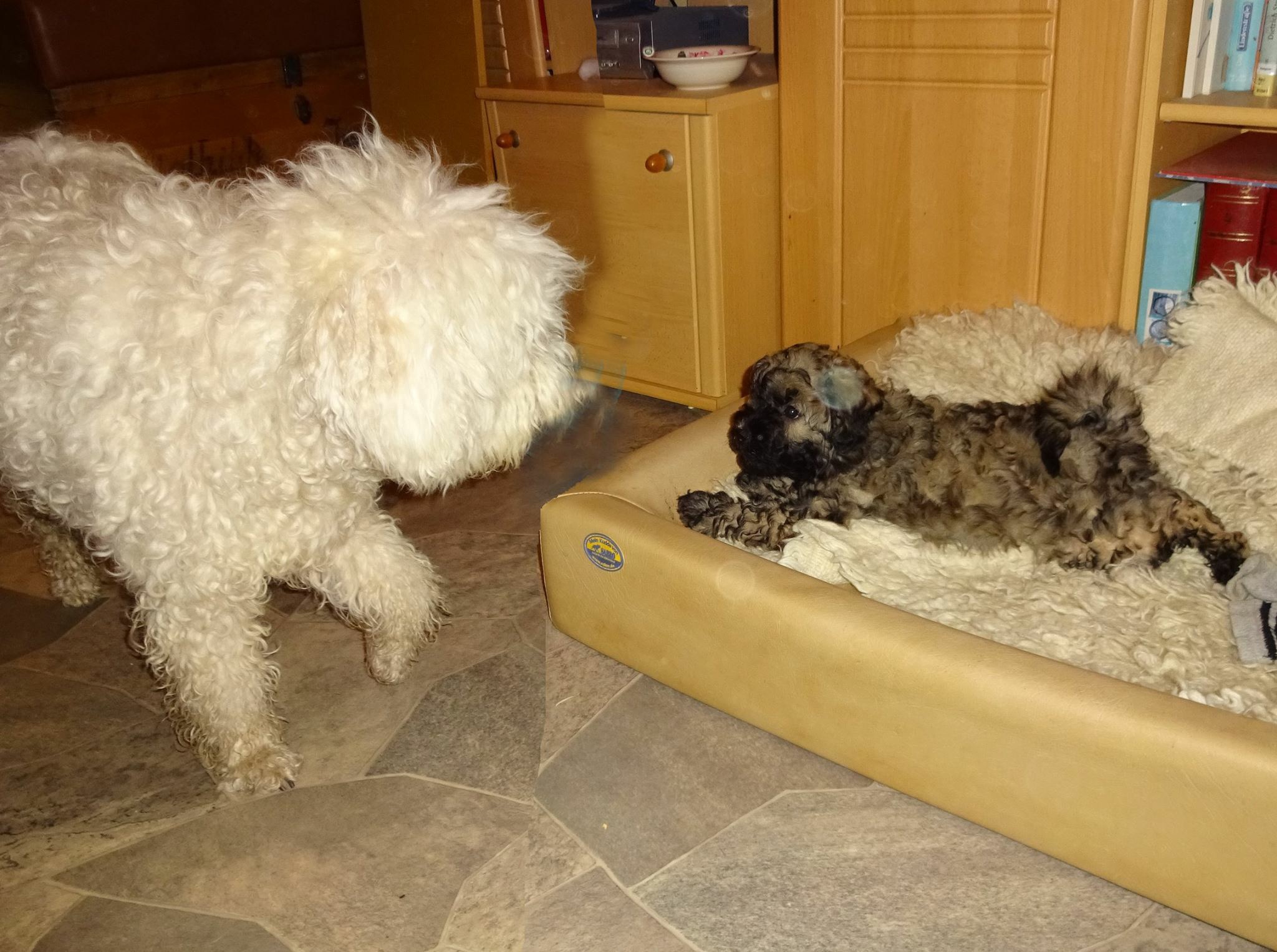 Einige von uns trauten zwar „der Sache“ nicht recht, denn es kam wieder so ein „Tisch“ zum Einsatz und für uns doch fremde Menschen, die sich die z.T. noch spärlichen Zähne , die Ohrenlänge, Fellbeschafenheit etc. angeschaut haben – und ob die Jungs wirkliche Jungs sind. Selbst nach unseren Schwänzen haben die „drei Damen“ geguckt …!
