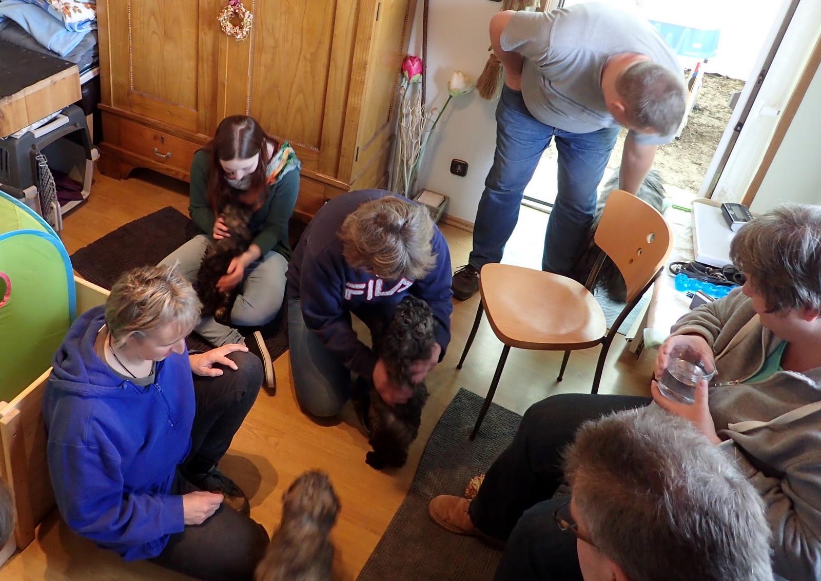 Nach einer laut (von uns Welpen!) durchgefeierten Nacht wurde es richtig voll im Welpenzimmer!! Anoki-Kimi´s neue Familie war angereist – leider ohne seinen neuen Kumpel Peppi. Später kamen unser Papa Rudi (Bobby Brown von den Powerpulis ) mit Familie und Daniela Klein, die Züchterin von Rudi mit netten Freunden dazu! Mensch, da ging die Post ab!!!